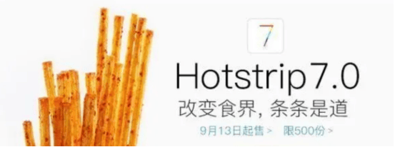 2016年9月8日,三里屯苹果旗舰店外排队的人群收到一份神秘礼物:印着Hotstrip 7.0的铝箔袋,背面用苹果官网款字体写着“比更大还更大”。龙电商总监把微博文案改成“今天,我们重新定义辣条”,配图是咬了一口的辣条截面——像素级复刻iPhone 7广告。这条微博转发破百万,评论最高赞是:“库克看了想报警。”